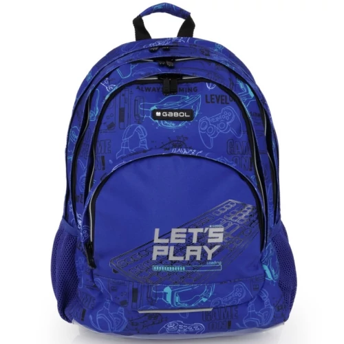 Gabol Gaming hátizsák. Kézben, és állítható (szivacsos és légáteresztő) vállpántjainak, valamint szintén szivacsos (ergonomikus) hátrészének köszönhetően háton egyaránt kényelmesen hordható. A hátizsák két főrekesszel, valamint két elülső és két oldalsó mellékrekesszel rendelkezik. Nagyobbik főrekeszében találjuk a névcímkét és egy mappák tárolására alkalmas zsebet, másik főrekeszében pedig egy kisebb extra zseb kapott helyet. A két elülső mellékrekesz remek hely egyéb iskolai eszközök, valamint személyes tárgyak tárolására. A táska két oldalsó rekesze, a gumírozott zsebeknek köszönhetően lehetőséget kínálnak egy-egy kisebb palack tárolására.